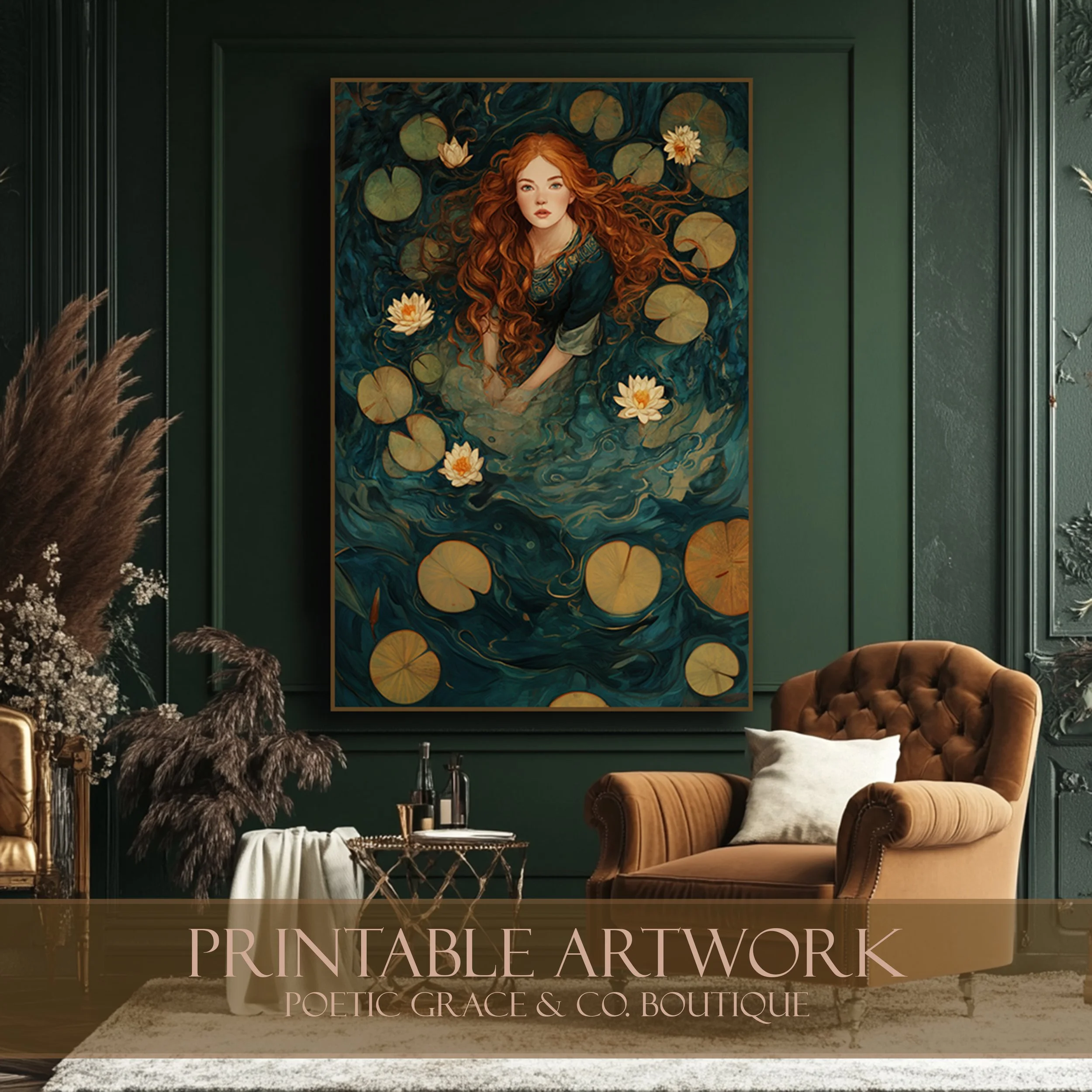 ✨ Keywords: moody wall art, romantic portrait print, Ophelia art, auburn hair artwork, woman in lake painting, dark romantic aesthetic, digital download decor, water lily wall art, emotional fine art print.